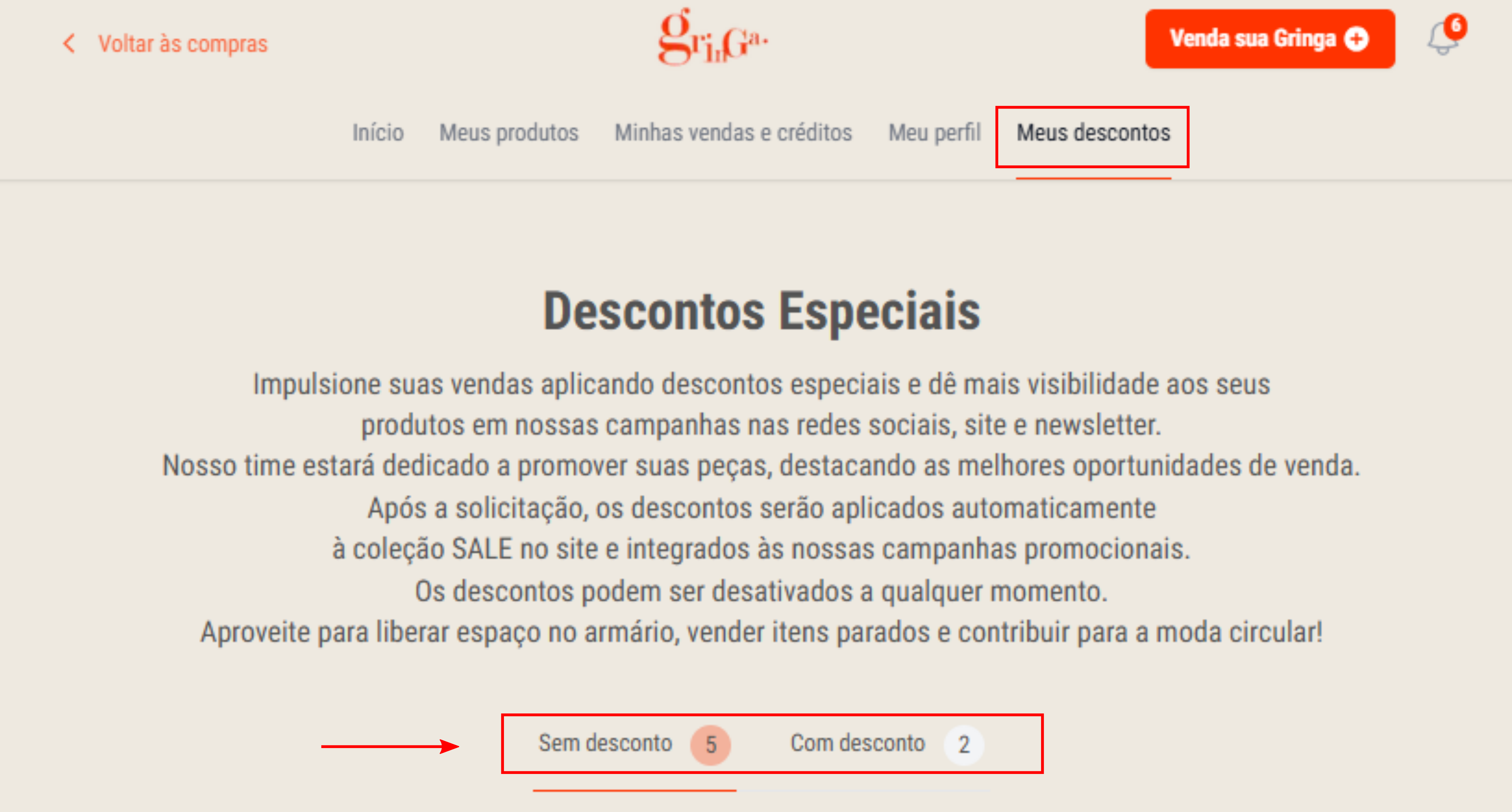 2) Vá até a aba "Meus Descontos" ou clique no card de Sale na página de Início